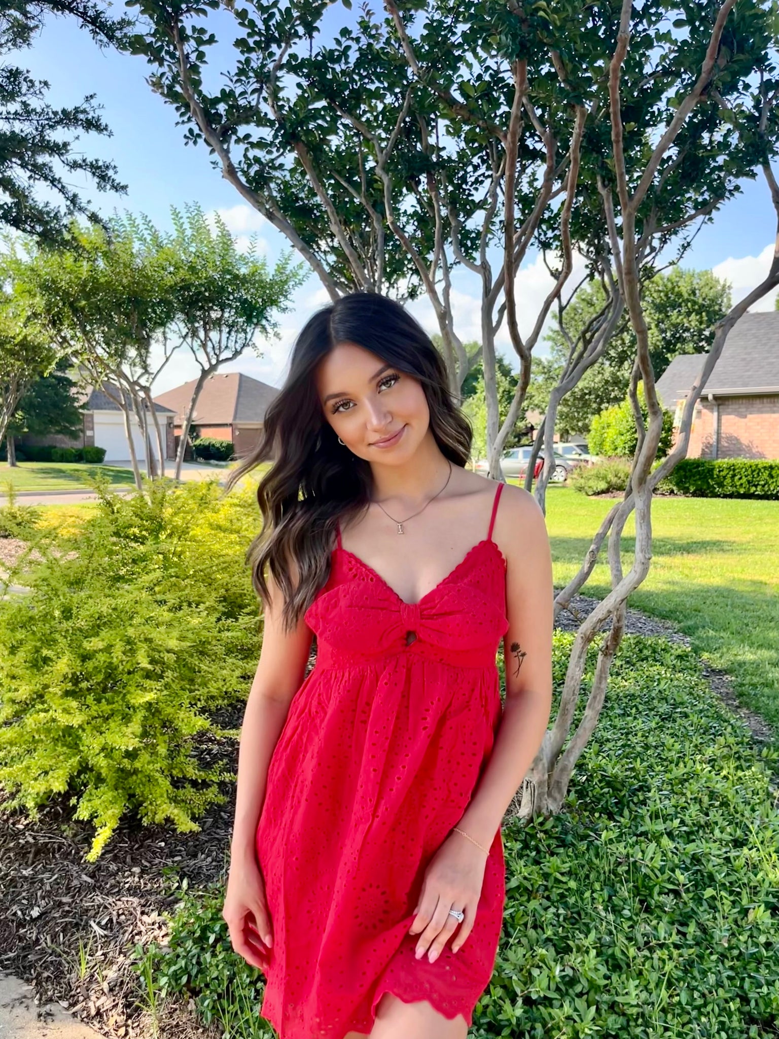Eyelet spaghetti strap baby doll flared dress with bow detail. Smocked back bodice.