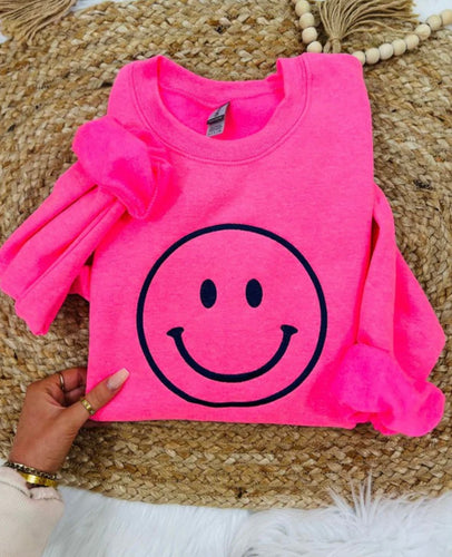 Happy Face Embroidered Sweatshirt - Neon Pink